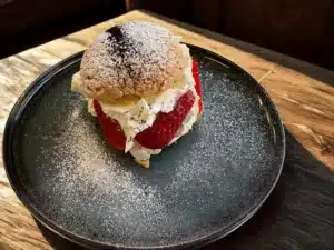 Un chou croustillant garni d’une crème légère aux fraises, accompagné d’une glace à la fraise artisanale. Un dessert tout en douceur, qui mêle tradition pâtissière et plaisir gourmand.