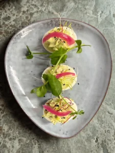 Des œufs fermiers délicatement garnis d’une mayonnaise maison à l’ail des ours, pour une touche raffinée sur un grand classique.