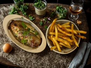 Une andouillette de qualité supérieure, gratinée au Champ-sur-Barse affinée fondant, accompagnée de frites maison dorées à souhait. Un plat généreux et typiquement champenois, à savourer sans détour.