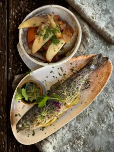 Truite cuite entière, parfumée au thym et accompagnée de légumes de saison juste poêlés, avec une mayonnaise ail des ours. Un plat frais et équilibré, qui célèbre les produits simples et bien travaillés.