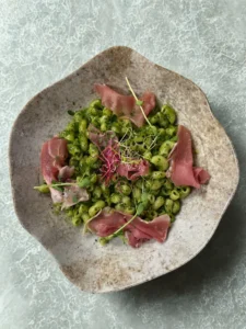Coquillettes Nominettes, à la crème d’épinard et son jambon cru