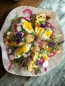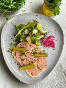 Mesclun, toast de Chaource au miel, œuf dur, radis croquants et pickles d’oignons, sublimés par notre vinaigrette maison.
