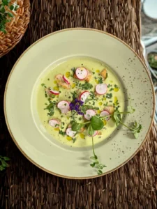 Velouté onctueux de petits pois frais relevé d’une pointe de menthe pour une touche de fraîcheur