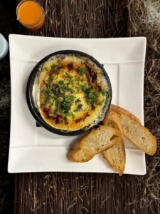 Chaource rôti au four, délicatement nappé de miel et parfumé au thym, servi bien fondant.