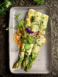 Asperges fondantes gratinées à la tomme, un plat simple et généreux mettant à l’honneur des produits locaux.